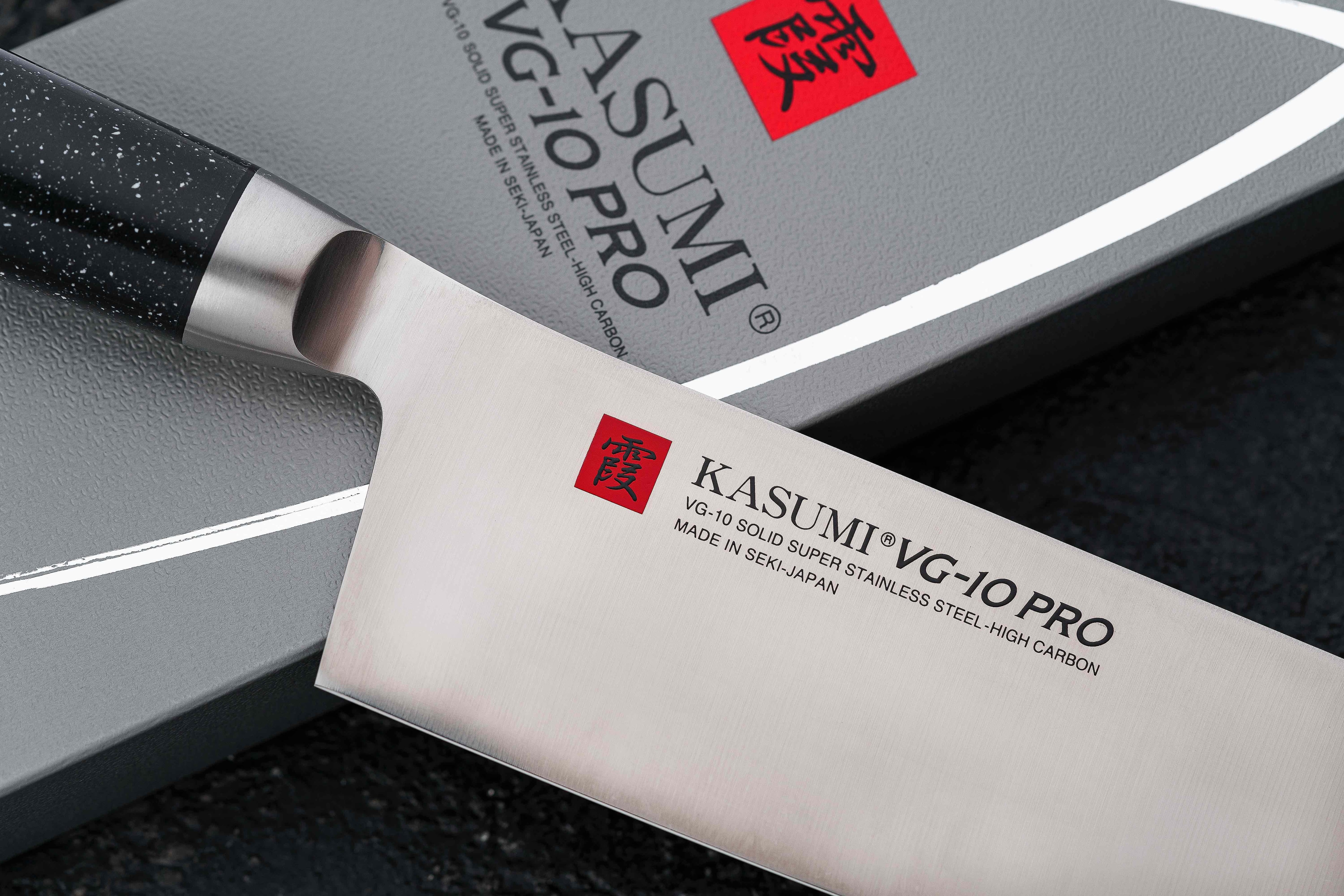 霞KASUMI VG-10 PRO包丁は他の霞KASUMIシリーズの開発・製造を経て蓄積した技術を結集し企画された最高峰なるプロ仕様包丁シリーズです。包丁用に特別に開発された武生鋼材 超硬質合金鋼V金10号の100%無垢材使用による強靭なブレードに卓越した技術を持つ職人による本刃付けが施されており、他の包丁に類を見ない切れ味と持続性を持ち、末永くお使い頂けます。 柄部には人工大理石が使用され衛生面且つ耐久性に大変優れています。