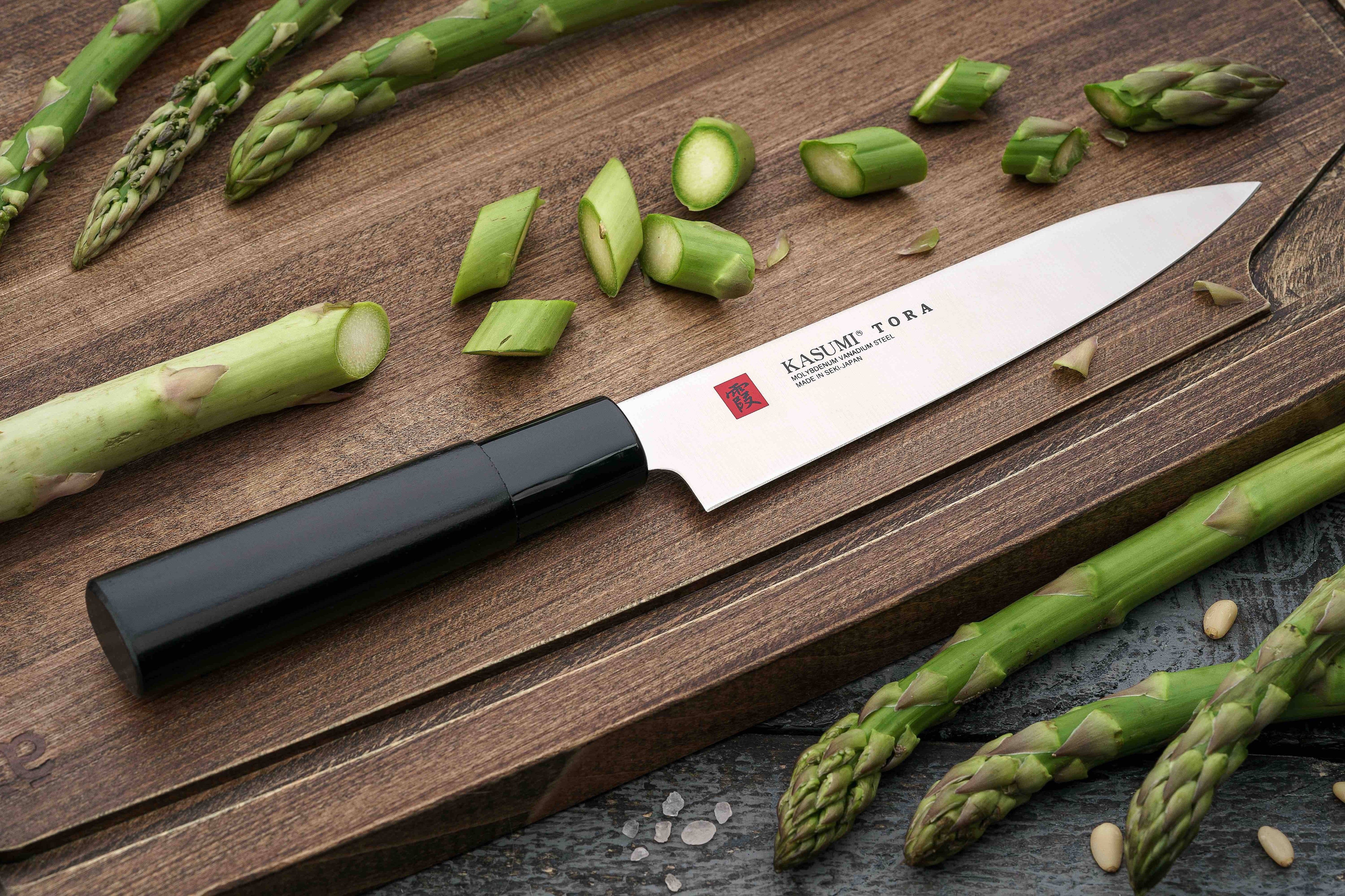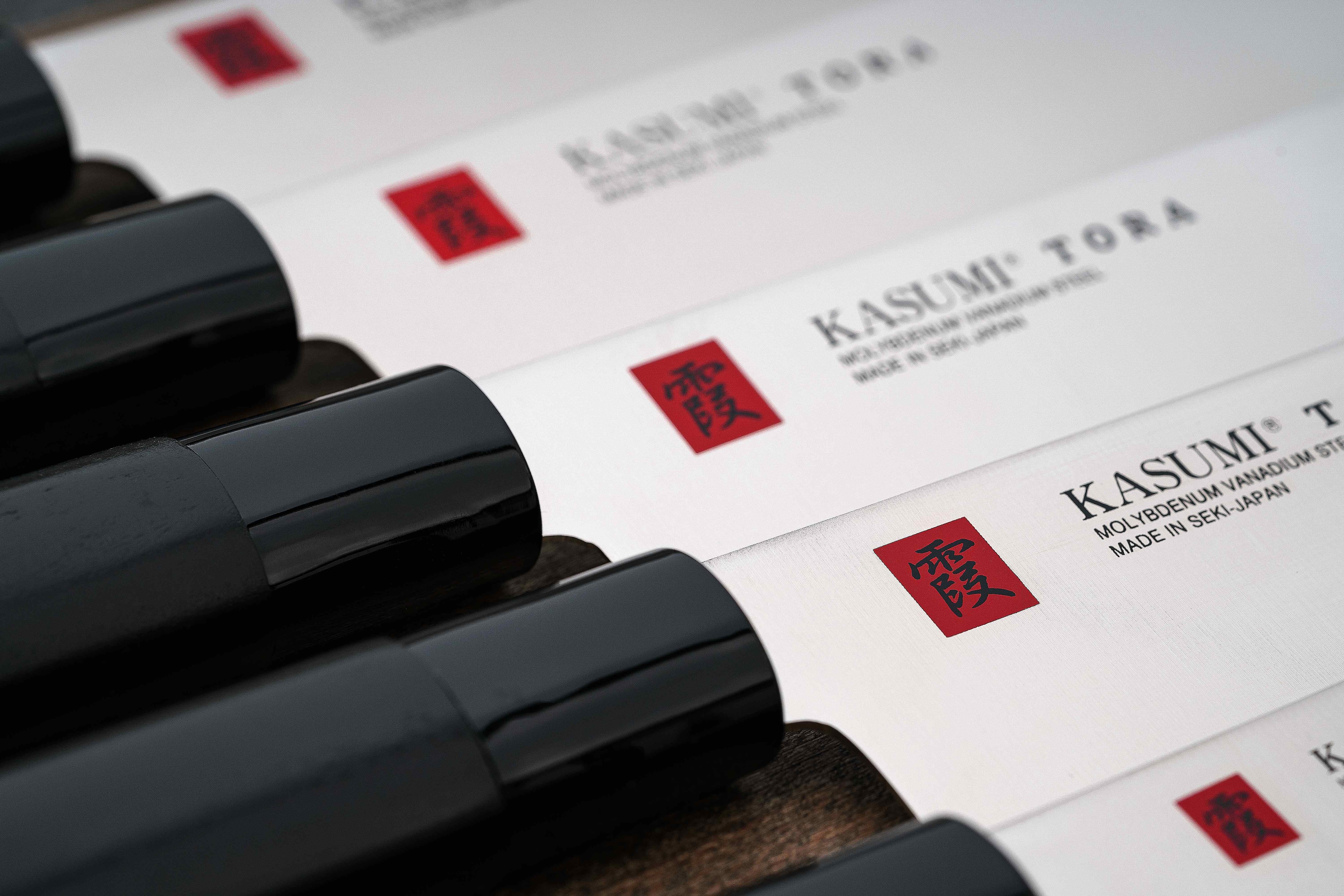 霞KASUMI TORA包丁は、十数年以上による他の霞KASUMI包丁シリーズの開発・製造を経て蓄積された豊富な製造経験を集結し、新たに開発されたシリーズです。 霞KASUMI TORA包丁は、日本刀制作と同じ伝統的技術をもった包丁製造の職人による手作業で作られています。 刃身(ブレード)には、鋭い切れ味を誇り、錆びにくく研ぎやすい特徴を持つ日本鋼高炭素モリブデンバナジウム鋼を使用しております。また、柄には硬化型エポキシ系樹脂(黒色)を塗装した朴の木を使用しておりますので、包丁全体のバランスを保ち、程よい軽さで手になじみ、末永くお使いいただけます。 霞KASUMI TORA包丁シリーズは、熟練した職人によって、一丁ずつ丁寧に仕上げられております。また、手頃な価格帯にもかかわらず、信頼性のある品質とお手入れがしやすいところから、初めて和包丁を手にしていただく方にもお勧めできる包丁です。