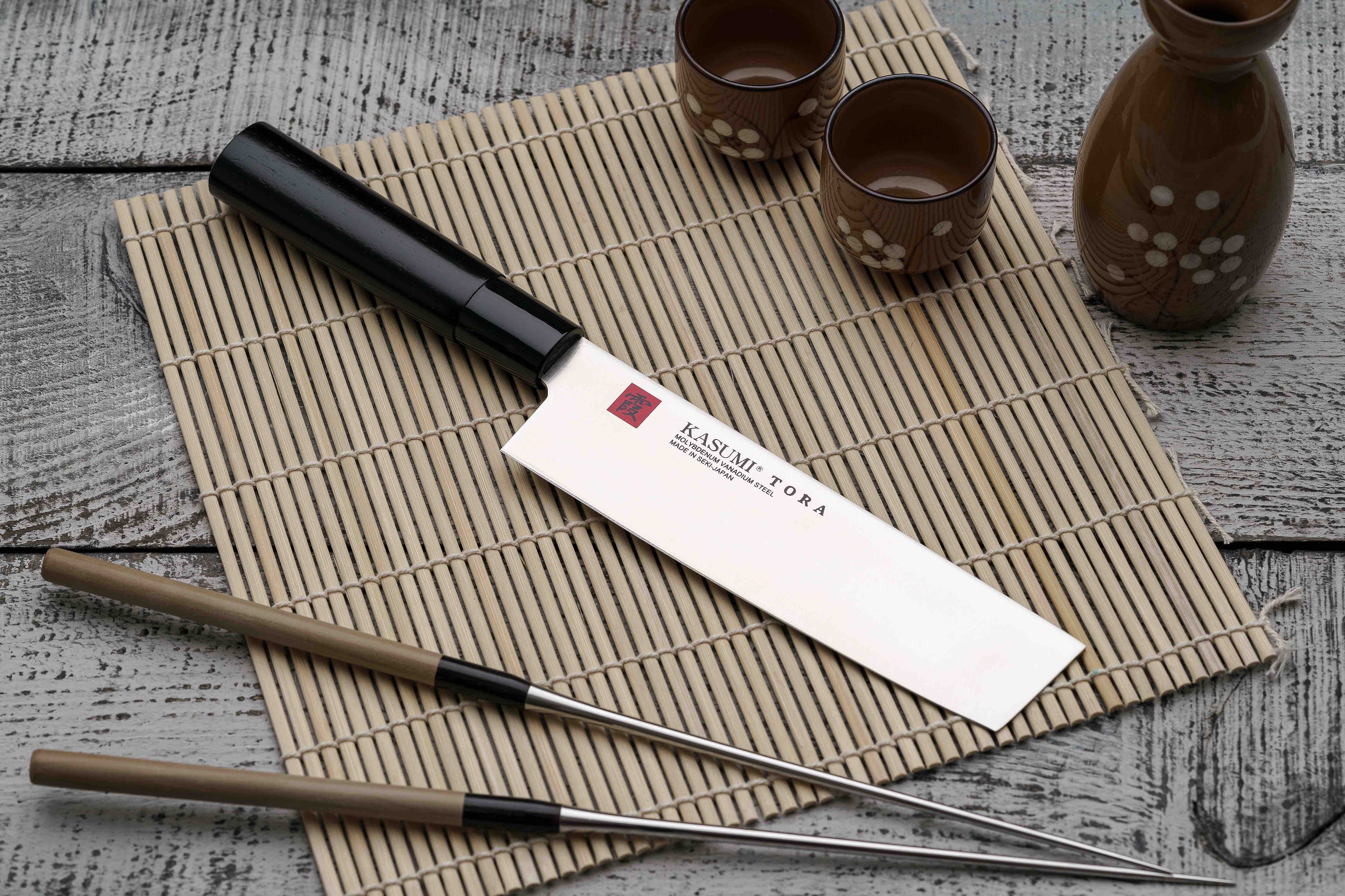 霞KASUMI TORA包丁は、十数年以上による他の霞KASUMI包丁シリーズの開発・製造を経て蓄積された豊富な製造経験を集結し、新たに開発されたシリーズです。 霞KASUMI TORA包丁は、日本刀制作と同じ伝統的技術をもった包丁製造の職人による手作業で作られています。 刃身(ブレード)には、鋭い切れ味を誇り、錆びにくく研ぎやすい特徴を持つ日本鋼高炭素モリブデンバナジウム鋼を使用しております。また、柄には硬化型エポキシ系樹脂(黒色)を塗装した朴の木を使用しておりますので、包丁全体のバランスを保ち、程よい軽さで手になじみ、末永くお使いいただけます。 霞KASUMI TORA包丁シリーズは、熟練した職人によって、一丁ずつ丁寧に仕上げられております。また、手頃な価格帯にもかかわらず、信頼性のある品質とお手入れがしやすいところから、初めて和包丁を手にしていただく方にもお勧めできる包丁です。