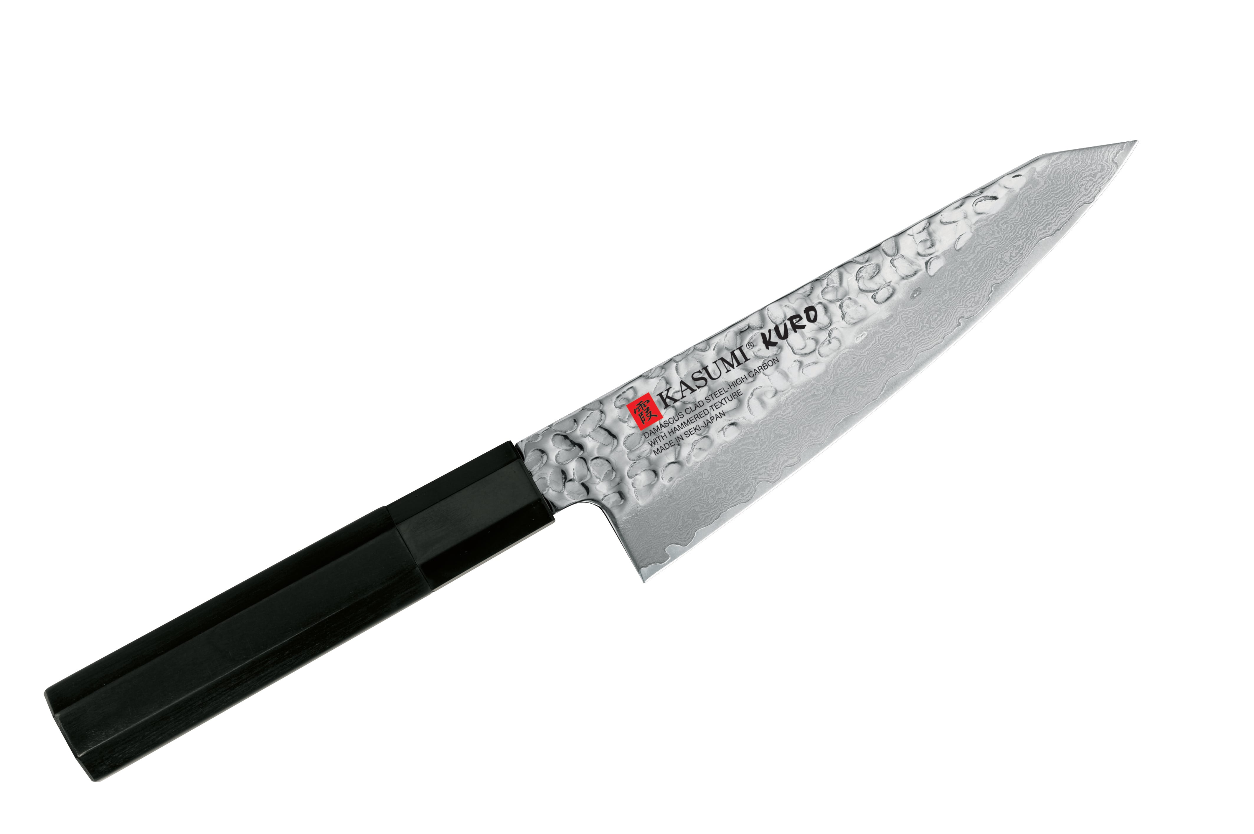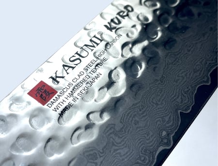 ダマスカス模様と鎚目模様が融合した包丁。芯材に高炭素モリブデンバナジウム鋼を使用し、その両側には32枚のステンレス層を重ね合わせ本鍛造することによって、流麗な「霞模様」が浮かび上がって、更に「鎚目仕上げ」を施すことで、日本古来の包丁イメージを醸し出しております。ハンドルは頑丈な黒積層強化木を八角形状にし、耐久性と高級感を両立した仕上がりになっております。